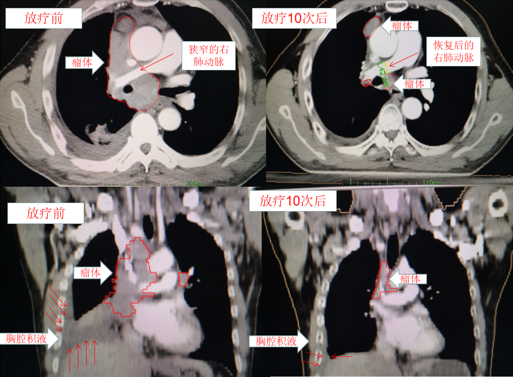 經過10次放(fàng)療後患者上(shàng)腔靜脈壓迫及肺動脈壓迫症狀明顯緩解,救患者生(shēng)命于危急關(guān)頭,後續繼續完成姑息性放(fàng)療,現(xiàn)患者定期複查及治療中。