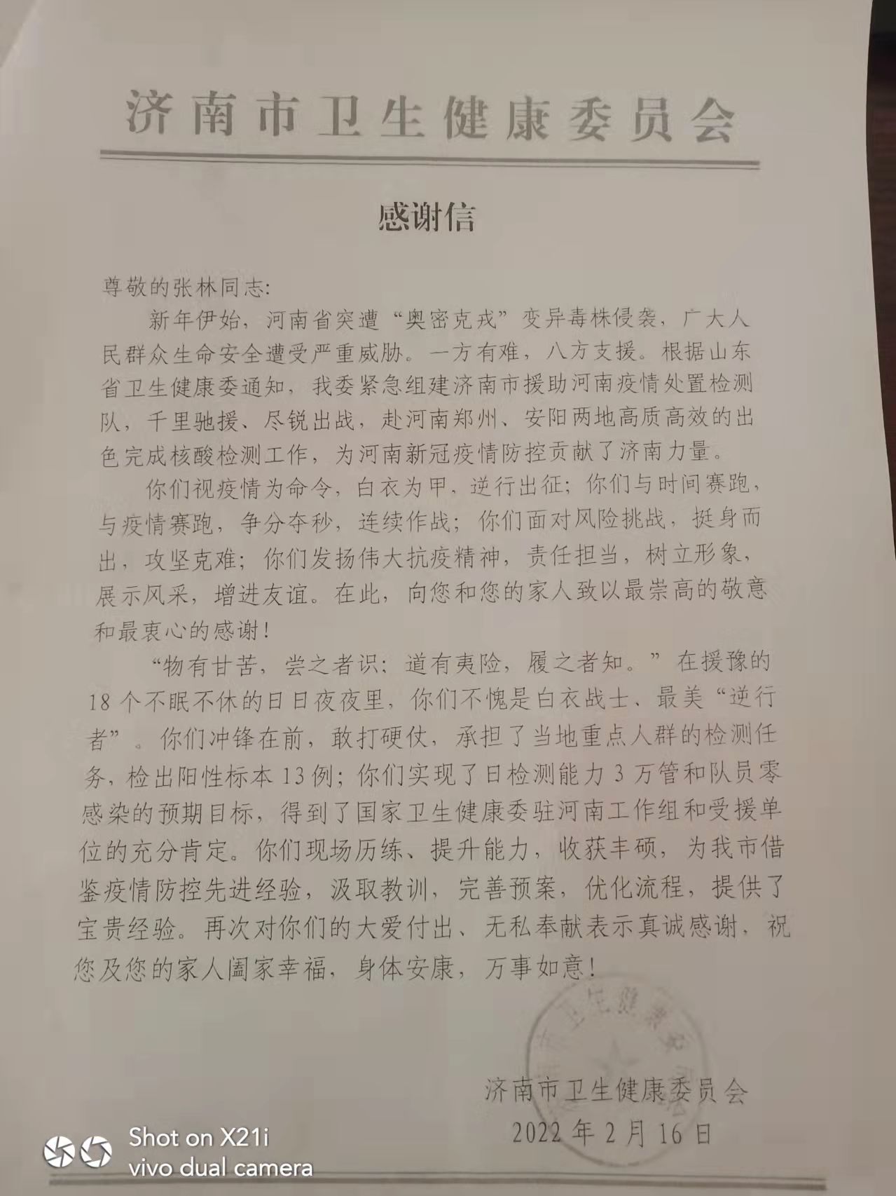 新(xīn)年伊始,河(hé)南(nán)省突發疫情,在抗擊新(xīn)冠病毒肺炎的緊要關(guān)頭,按照市(shì)衛健委統一(yī)部署,選派人(rén)員(yuán)組建援豫核酸檢測隊趕赴河(hé)南(nán),我院積極響應号召,第一(yī)時(shí)間(jiān)選派我院張林同志支援河(hé)南(nán)。