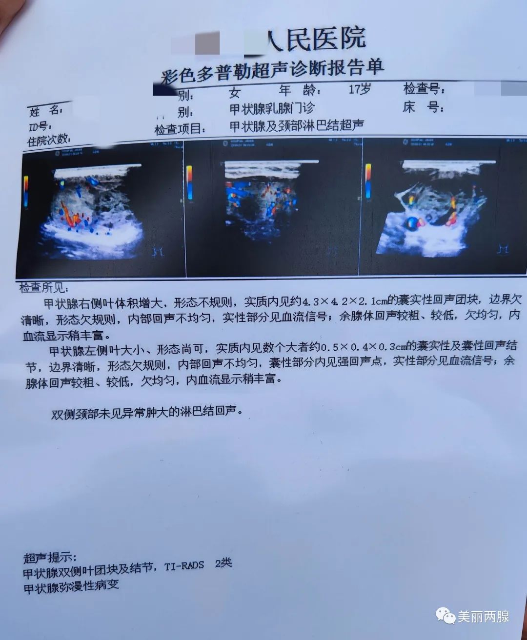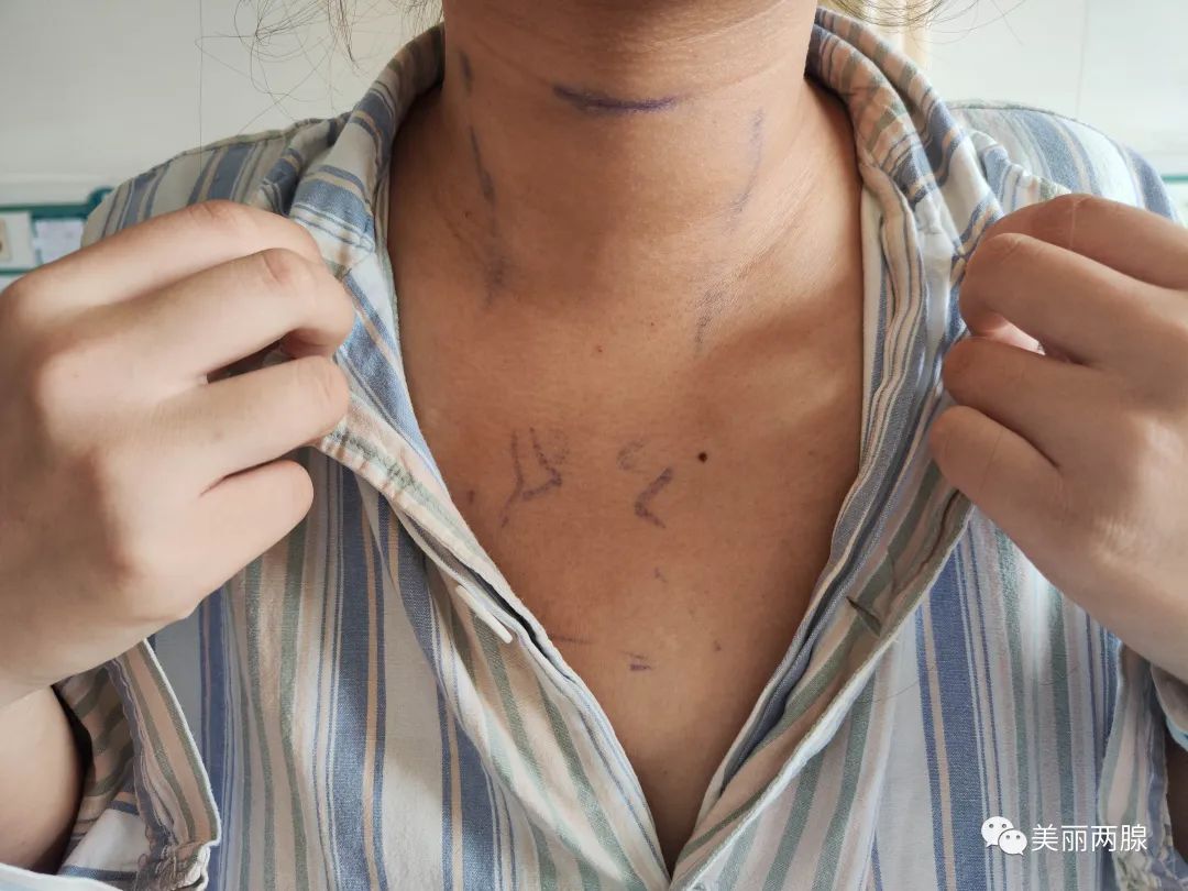 患者女(nǚ)性,17歲,未婚,高二學生(shēng),發現(xiàn)甲狀腺結節(4.3cm×4.2cm×2.1cm)來(lái)診,兩腺外科醫(yī)生(shēng)接診後,考慮患者青少年女(nǚ)性,學生(shēng),對頸部美容有較高要求,可行腔鏡甲狀腺手術,收入院,經充分(fēn)術前準備後,給予腔鏡下(xià)行甲狀腺手術治療,術後病理(lǐ)良性腫瘤,手術順利,目前已經恢複健康,正常生(shēng)活。該手術既可以做到頸部無疤痕,患者手術的私密性又得到了(le)保障。