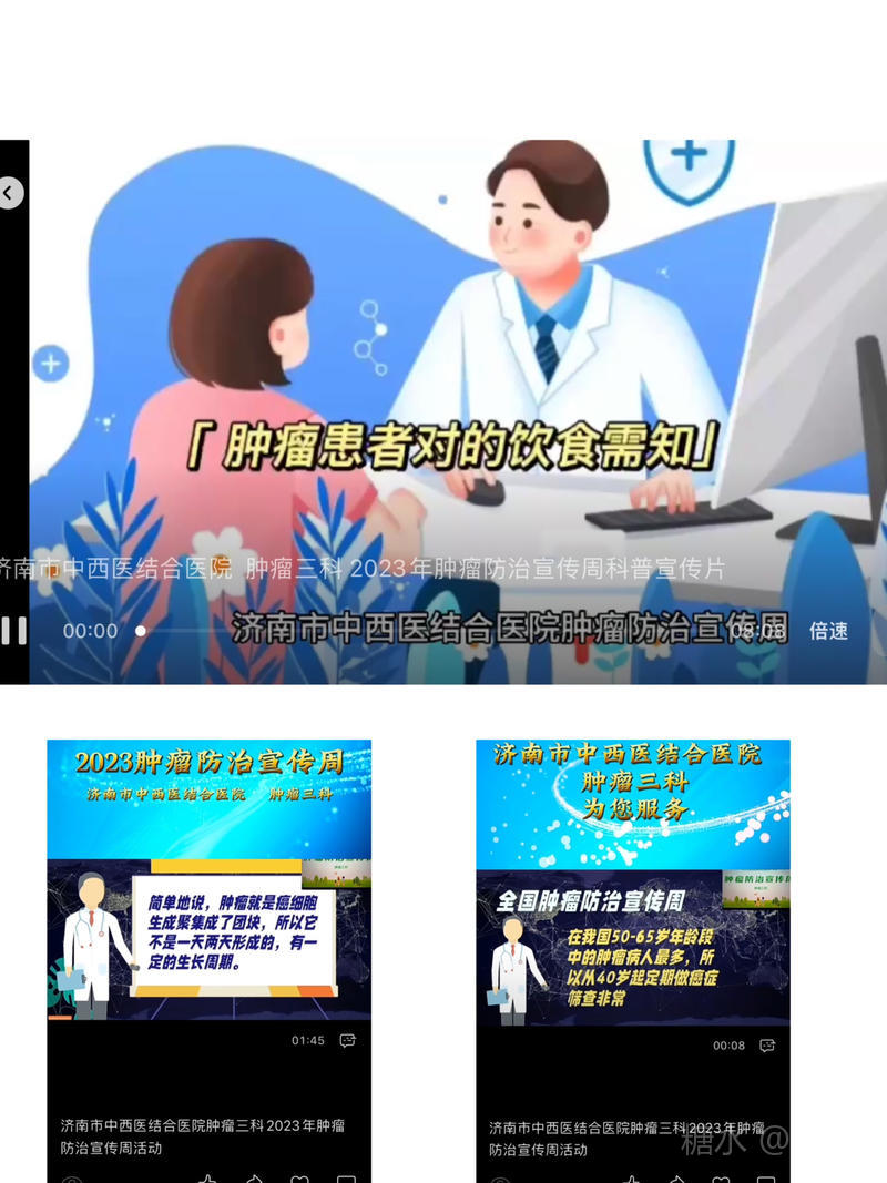 同時(shí)科室通過微信視(shì)頻号發布腫瘤相關(guān)健康知識,廣泛宣傳,引導公衆對腫瘤有科學的認識和正确判斷,提高全民(mín)的癌症防治意識和能(néng)力。目前腫瘤三科已全面開展各種實體(tǐ)瘤及血液腫瘤的化(huà)療、放(fàng)療、靶向、免疫、介入、中醫(yī)中藥等綜合治療,為(wèi)廣大患者的健康保駕護航!